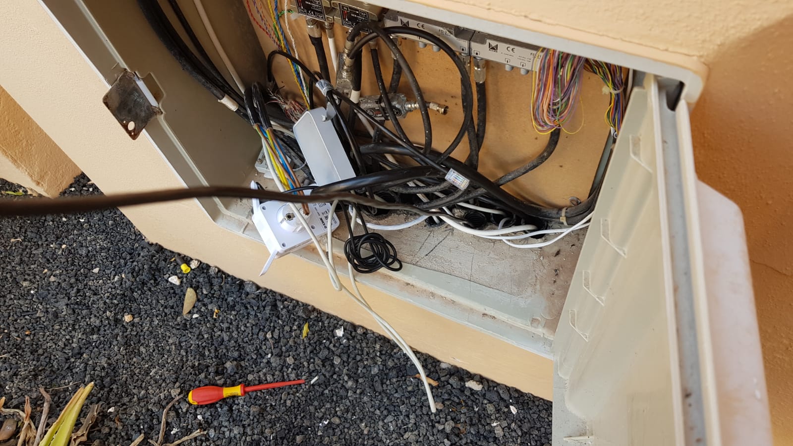 A customer wanted internet connection, so me and the other students started cutting and setting up cat cable inside a tube inside a small metal wallpanel just outside her house in attempt to wire the cable to go into her house through an underground wire system.