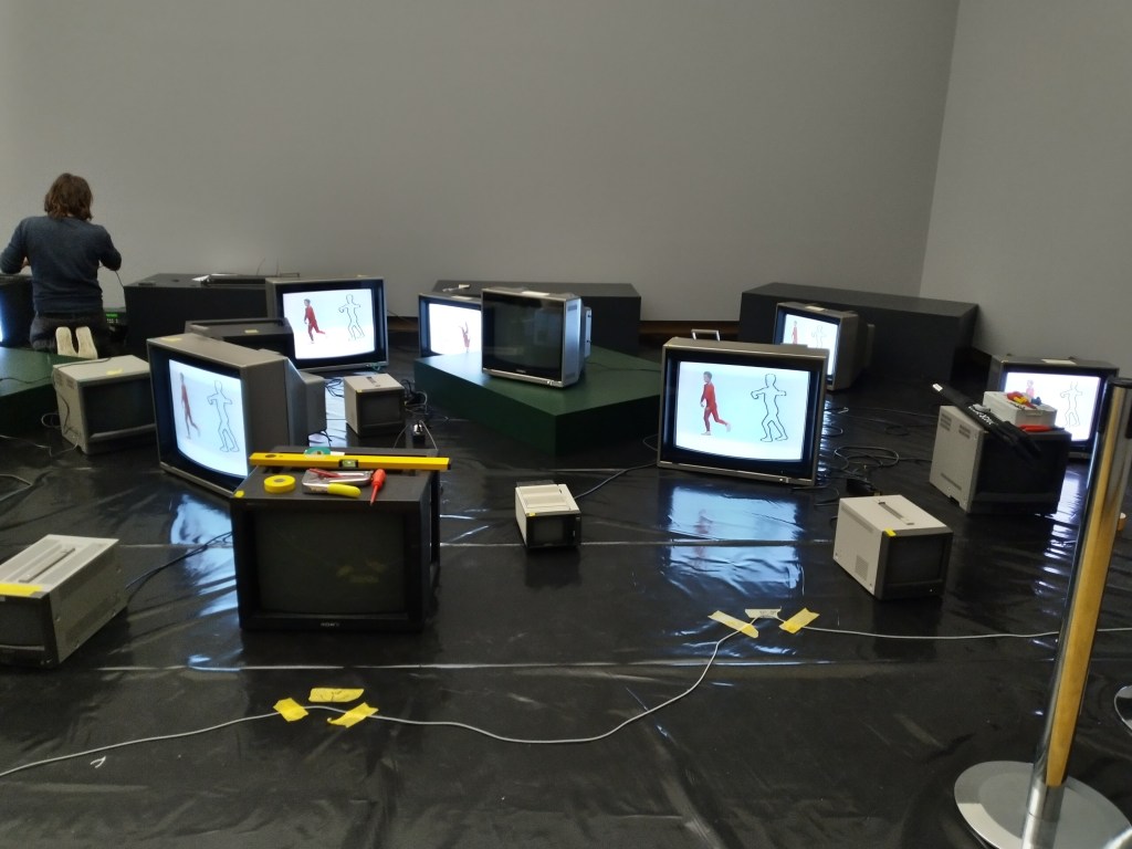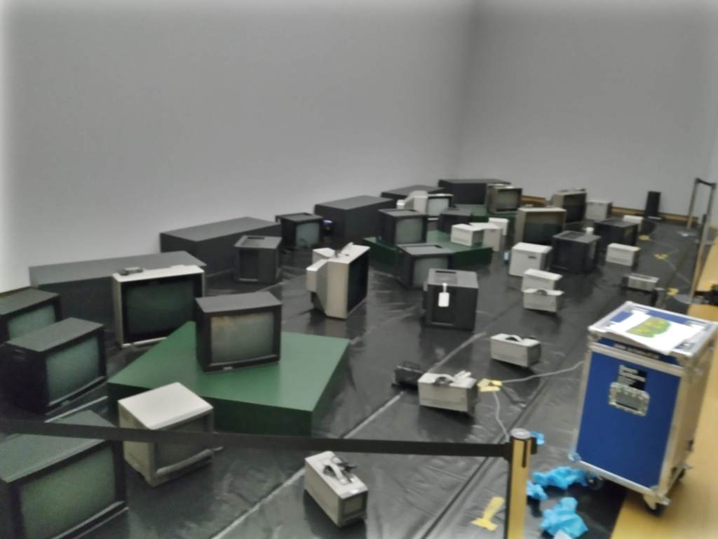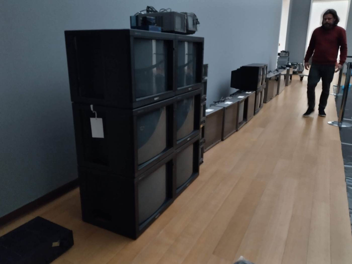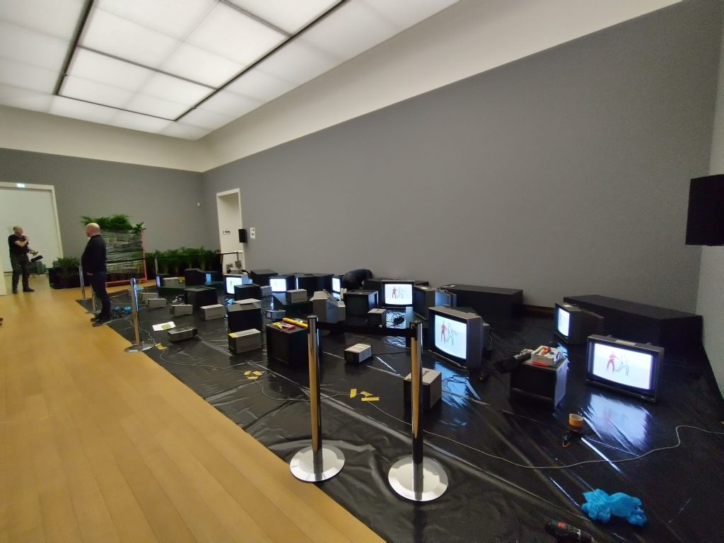 After the rough layout of the monitors to their approximated positions on the floor, it was possible to start pulling power for the monitors. Cabling for power was done in 3 separate groups as the draw is bigger with these monitors. This was all pre-planned by the museum so it was somewhat easy. Connecting the dots so to say.