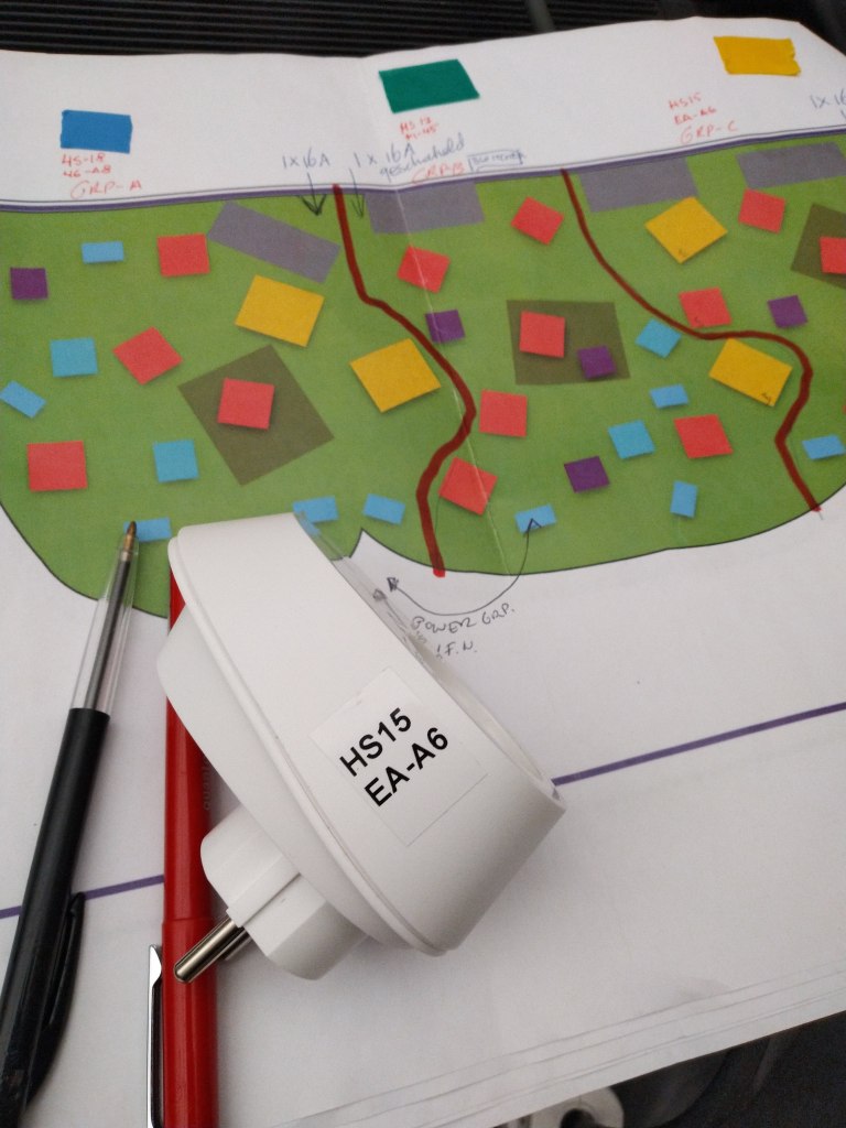 In this cased I made use of 3 different colored electrical tape, on the plans and on the monitors, to quickly see which monitors where still un-powered.