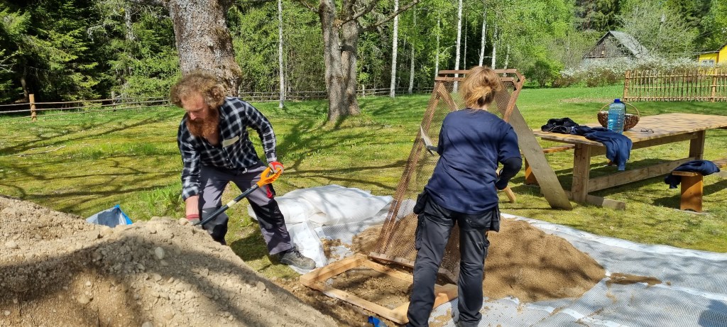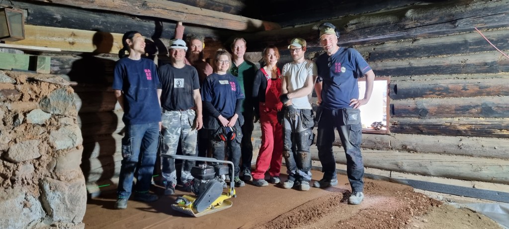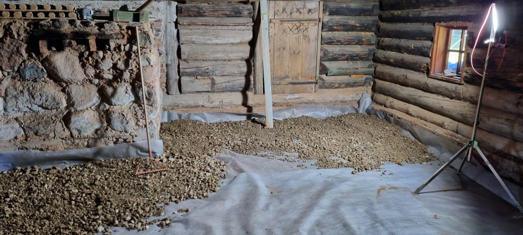 Lähtökohta Rasekon savirakentajaopiskelijoiden tullessa paikalle oli siis työhuoneen lattia, josta oli vanha lattia poistettu, kuoppa oli pohjaltaan hienoa hiekkaa, syvyyden vaihdellessa kohdittain ehkä keskimäärin 30 cm alimpien hirsien alapinnasta. Betonisokkeli ei myöskään ollut vaaterissa, vaan vietti ulkohuoneeseen päin ehkä 5-10 cm.