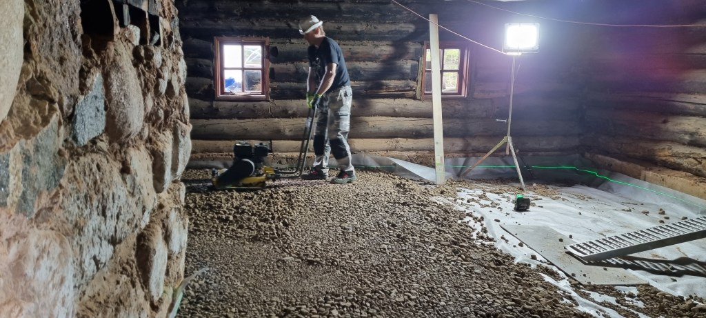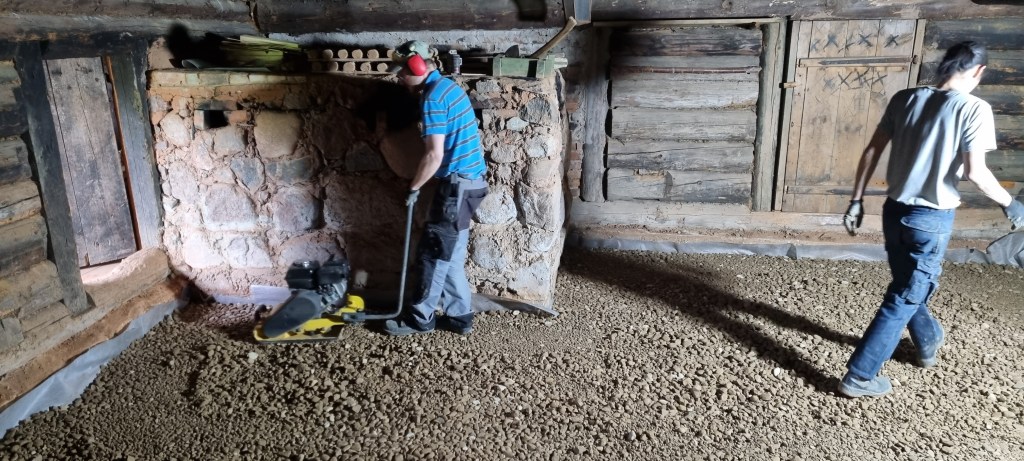 Rakennuksen tilanne ennen kunnostamista kuulosti aika mielenkiintoiselta. Rakennuksen katto vuoti, tulipalo oli tuhonnut osan kattohirsistä ja kiviseinät olivat rapautuneet. Tallissa oli säilytetty lannoitteita ja niistä oli imeytynyt suoloja seinärakenteisiin. Kosteusmittausten perusteella arvot ylittyivät reippaasti. Hankkeeseen saatiin rahoitusta EU:lta ja kunnalta vuonna 2016. Kunnostuksen aikana työmaalla pidettiin myös savi- ja kalkkirakentamiseen liittyviä kursseja. Katon ja seinien eristemateriaalina on käytetty muun muassa selluloosaa ja hamppua.