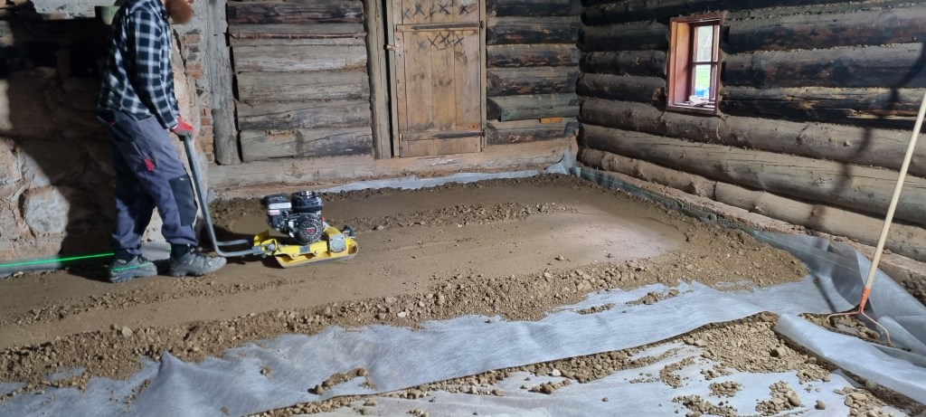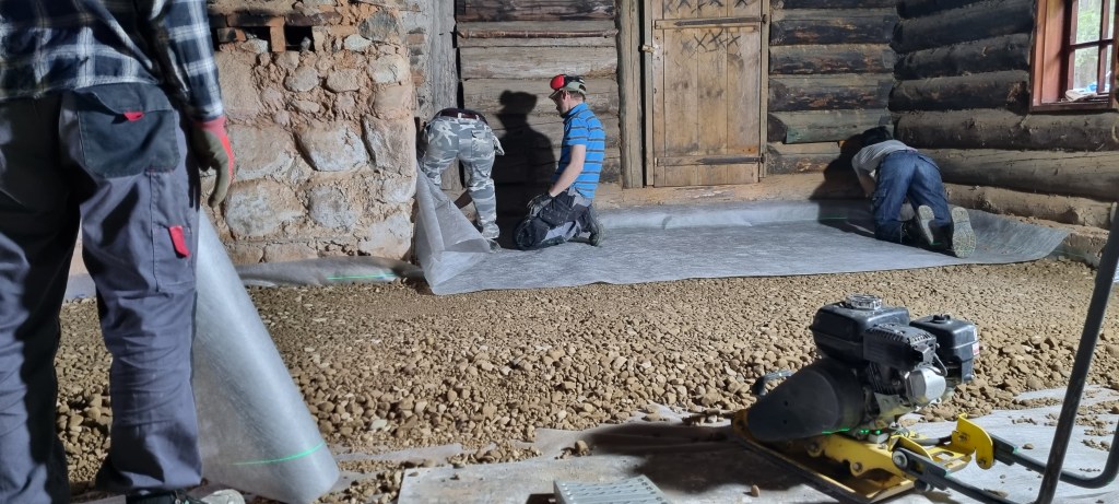Lattian hiekkapohja tasattiin ja sen päälle levitettiin kuitukangas estämään vesieristyskerrokseksi ajatellun 10 cm paksun karkeamman 10-32 mm kiviaineksen uppoaminen hiekkaan. Yläpinta vaa’ittiin laserin avulla tasaan ja ajettiin maantiivistäjällä tiiviiksi. Käytettävissä ollut maantiivistin oli varsin kevyt, joten kerrokset päätettiin tehdä kahdessa erässä siten, että täyttöpaksuus oli kussakin noin 7-8 cm ja lopputuloksena yhteensä noin 10 cm tiivistetty kokonaispaksuus.