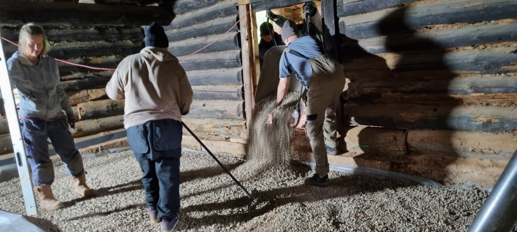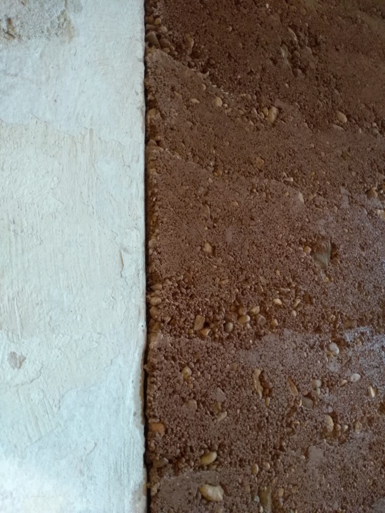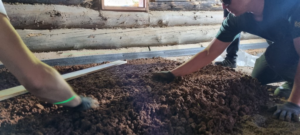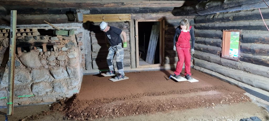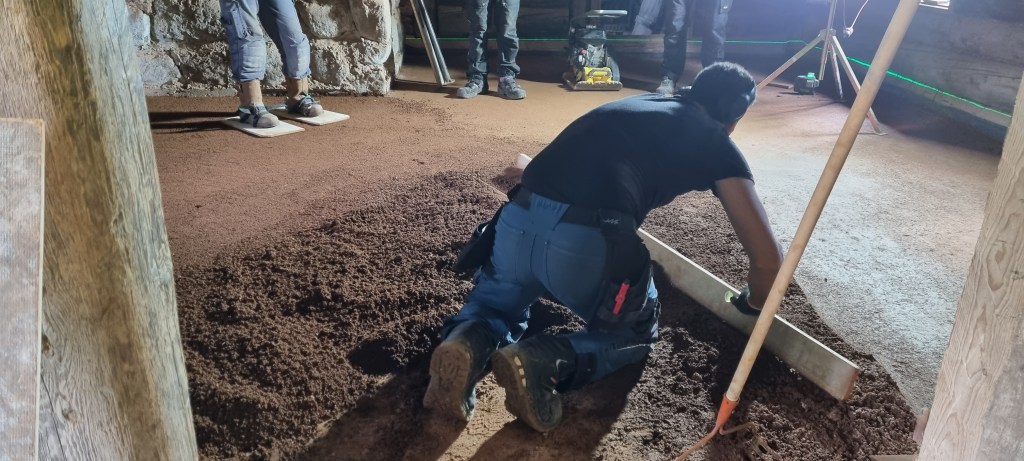 Tämän tason jälkeen aloitettiin tiistaina varsinainen savilattiakerrosen valmistus. Malvon tekemien koekappaleiden pohjalta todettiin mikä koekappale vaikutti lupaavimmalta ja sen pohjalta päätettiin resepti, joka oli pohjakerrokseen: