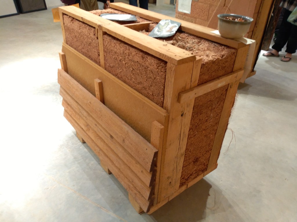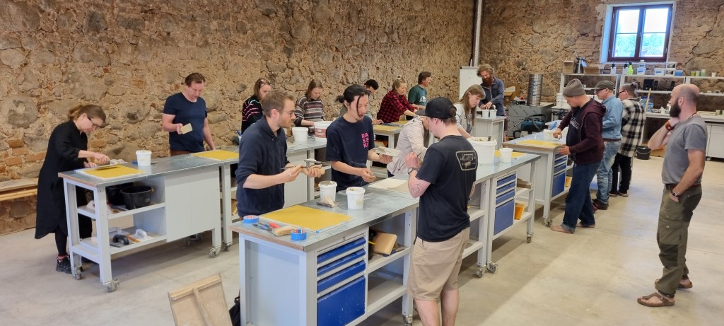Päivän aikana pohdittiin myös savirakentamisessa käytettäviä teollisempia materiaaleja kuten vaahtolasia ja sen ominaisuuksia. Lopuksi keskityimme vielä hetkeksi erilaisista saven olomuodoista valmistettuihin lopputuotteisiin ja näytteisiin: poltettu tiili on kuivaa savea, kosteasta voi tehdä massiivirakenteita, elastisesta myös tiiliä, viskoosisesta laasteja ja nestemäisestä maalia. Tässä kohti etenkin viimeistelylaastit ja niiden eri sävyt herättivät mielenkiintoa. Kiiltäväpintaista stucco-seinää ja marokkolaisesta perinteestä tulevaa tadelakt-pintaa tekee mieli tunnustella kun sellaisen näkee. Virolaisen Ukumajan oma versio tadelaktista on gekolakt ja uudempana tuotteena marmorino, joka nimenä kertookin jo miltä pinta näyttää. Monen ääneen esitetty toive päästä kokeilemaan marmorinoa toteutuikin pari päivää myöhemmin.