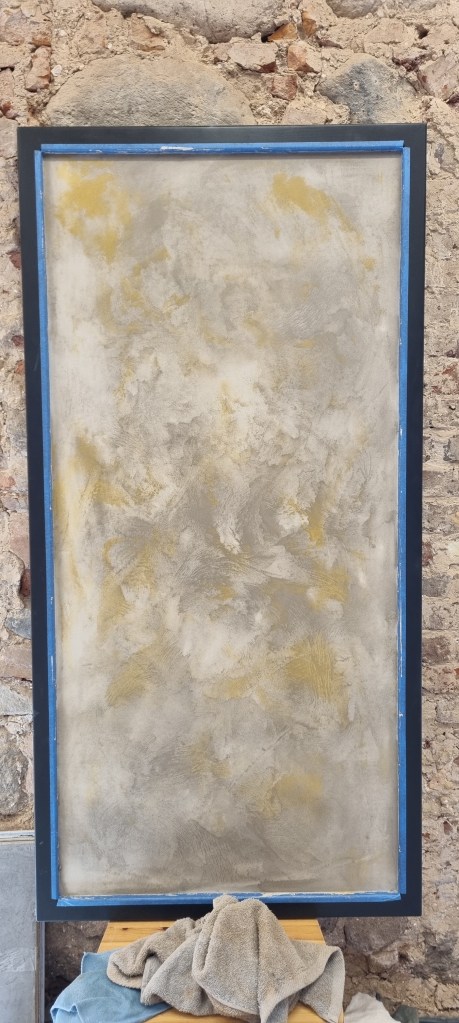 Tiiviin tietopläjäyksen jälkeen pääsimme taas käytännön toimintaan. Saimme eteemme savirapatun levyn, eri värisiä viimeistelylaasteja ja sabluunoita. Tästä tekniikasta toimme kotiin tuliaisina tauluja tai uusia ideoita kurssitoimintaan ja koristemaalauksiin tuleville saviseinille.