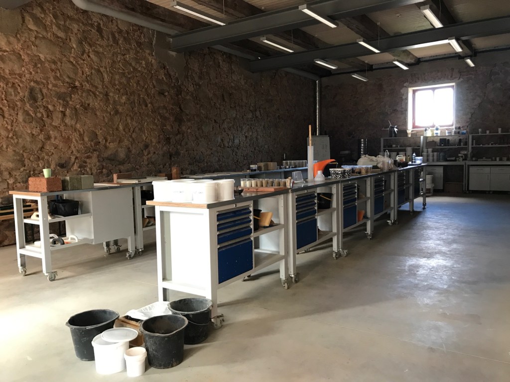 Työhuoneen vanhaa savilattiaa oli harkittu käytettäväksi uudelleen seostamalla sitä pyrkien saavuttamaan sille parempi lujuus. Analyysien pohjalta sen todettiin kuitenkin olen pääsääntöisesti hyvin pienirakeista ja hyvinkin silttistä. Tästä syystä vanha massa oli päätetty olla käyttämättä ja se oli kärrätty pihan perälle.