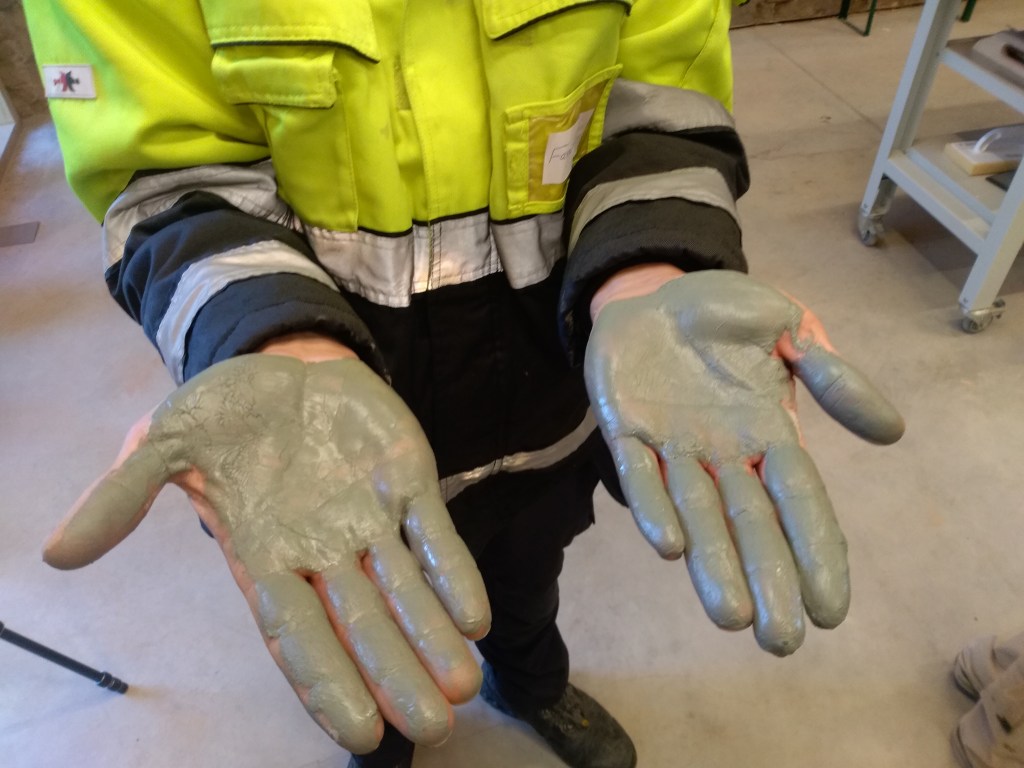 Ensimmäisen työpajapäivän aloitimme pitkän pöydän alkupäästä tutkimalla saven ominaisuuksia eri aistien avulla. Savipitoinen eli lihava savi on muokatessa elastista, siitä voi pyöritellä madon ja sen peseminen käsistä ei ole ihan helppoa. Kun vesilasiin pudottaa kuivan kokkareen lihavaa savea, se “kohisee”. Savea voi myös haistella ja maistella. Virosta löytyy punasävyistä savea ja Suomessa pääväreinä ovat harmaan sävyt. Tuttuja juttuja, mutta myös uutta ja päivän aikana tuli asioita erittäin hyvin havainnollistettuina.