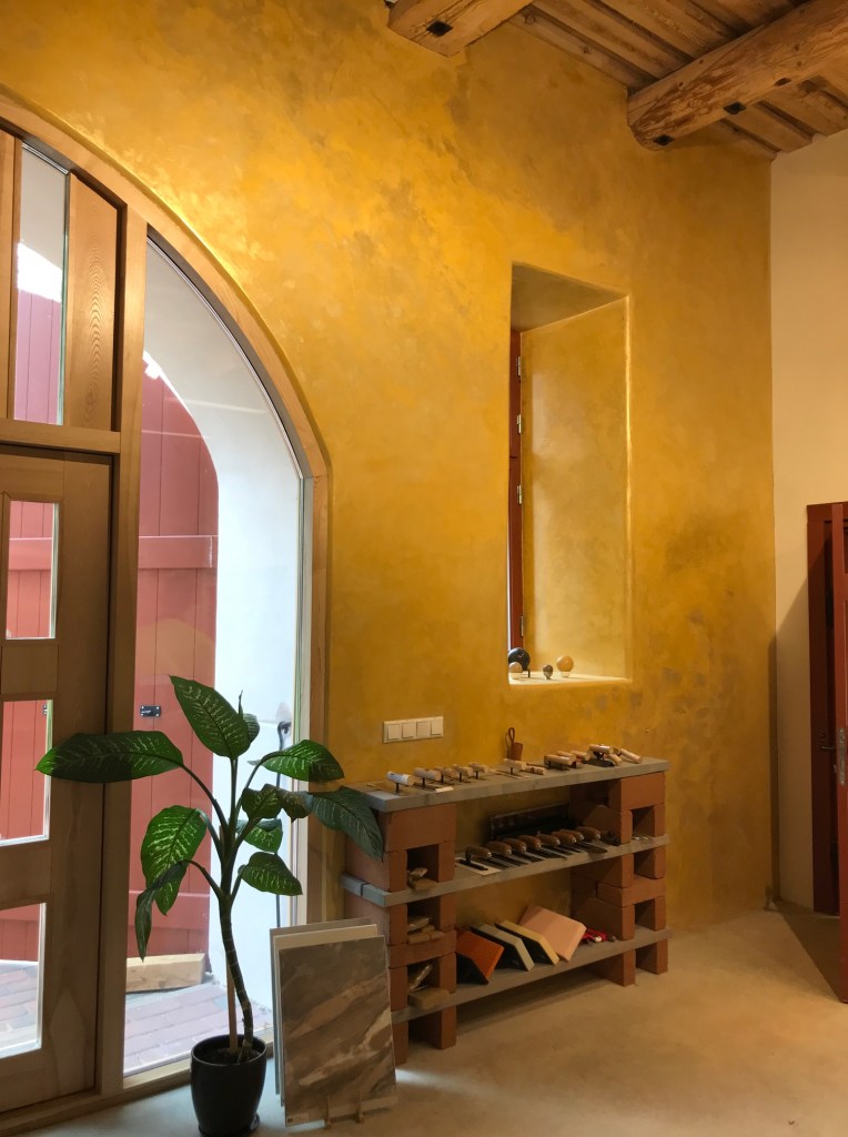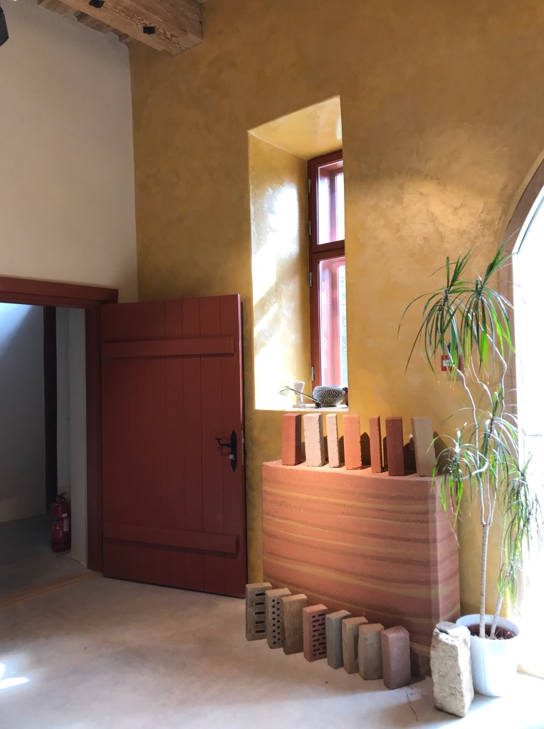 Työ on kannattanut. Kunnostustarinan jälkeen teimme kattavan kierroksen koko rakennuksessa. Toisen kerroksen luentotilassa ja toimistohuoneissa näkyy vanhaa ja vaihdettua hirttä sekä erilaisia rapattuja pintoja. Saven ja kalkin erilaiset sävyt jatkuvat tilasta toiseen. Yläkerran käytävästä löytyy mustan- ja violetin sävyjä, pitkän käytävän päässä kiintopisteenä on viimeistelylaasteilla tehty koristemaalaus. Alakerrassa katse kiinnittyy karkeampaa hiekka-ainesta sisältävään massiivisaviseinään ja Saviukumajan tilojen ylellisen kiiltävään keltaisen ja kullan sävyiseen pintaan. Viereisessä huoneessa on näyttelytila, jossa muun muassa havainnollistetaan mitä eriste- ja rappauskerroksia erilaisissa ekologisissa seinissä voisi olla. Rakennuksen päätyhuone on enemmän tutkimuskäyttöön. Sen kiviseinässä on saviseoksia, joihin on kiinnitetty mittareita seuraamaan muun muassa kosteuden ja lämpötilan muutoksia.
