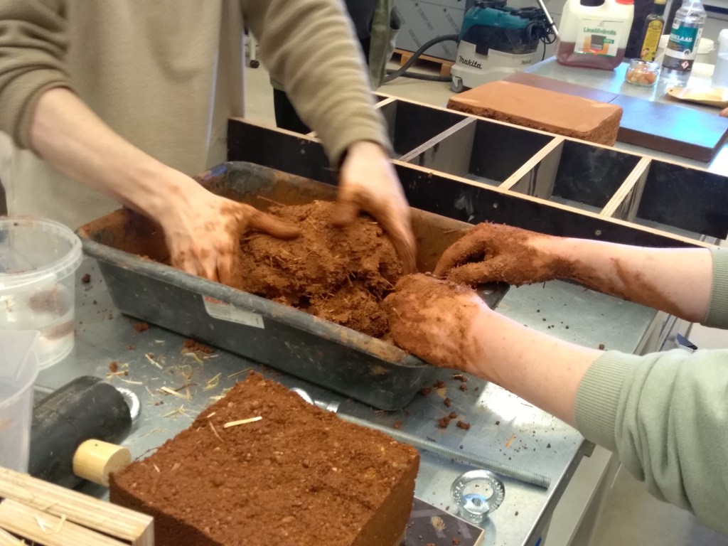 Mikä merkitys on sillä jos maa-aineksen annetaan järjestäytyä eli seosta tiivistetään? Pääsimme yhdessä toteamaan, että “täristäen” kuivalla hiekalla täytetystä astiasta ei puukeppiä saa lihasvoimin vedettyä pois. Lujuuskokeita jatkettiin ottamalla lasten hiekkasankot esille. Yksi taputteli kostean hiekan sankoon tiiviisti käsin. Sitten kakku kumottiin pöydälle ja kokeiltiin paljonko kakkunen kestää lisäpainoa päällään ennen kuin hajoaa. Toinen teki vastaavan kakun, mutta tiivisti hiekan sankoon puukepillä (rammed earth). Kolmas kakku tehtiin sekoittamalla hiekan sekaan puolet tilavuudesta pellavakuitua. Ja kuinkas kävikään. Ensimmäinen kakku kesti painoa pari kiloa ja “rammed cake” moninkertaisen määrän. Kolmannen kakun päälle nousi henkilö ja vielä toinenkin, mutta tämä kakku vain kesti edelleen. Entäs mitä olikaan kapillaari-ilmiö? Tätä havainnollistettiin kaatamalla veteen kuivaa hiekkaa veden pintaa korkeammaksi keoksi. Vesi lähti imeytymään hiekkakasaa ylöspäin. Tästä on lyhyt ajatusmatka siihen, mitä esimerkiksi maakosteus saa aikaan rakenteissa, jos edellä havaittua asiaa ei oteta huomioon.