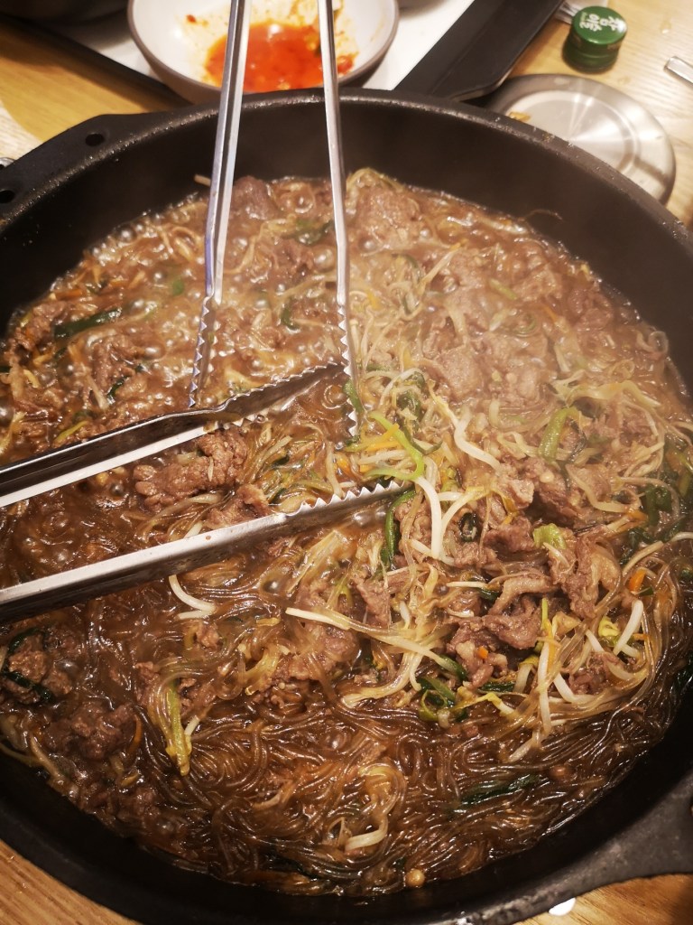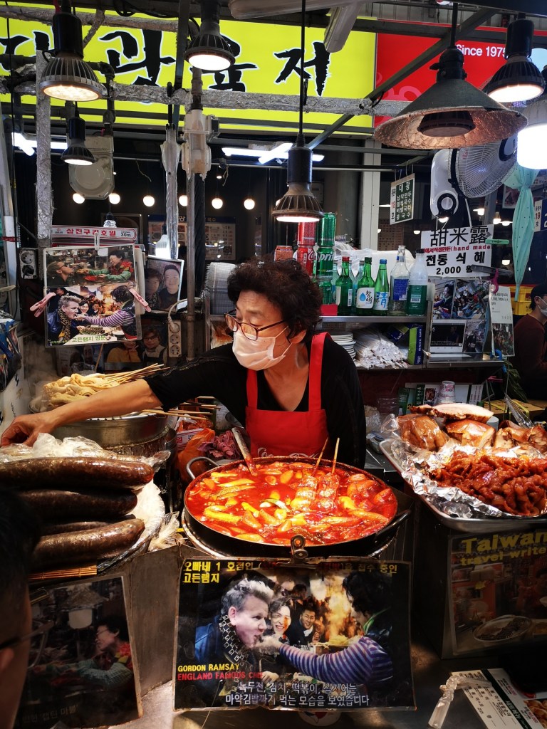 Ruokakulttuuri Koreassa näkyy kaikkialla. Olemme syöneet niin lounaat kuin päivällisetkin korealaiseen keittiöön tutustuen. Lihaa tai kalaa, riisiä, nuudelia sekä kasviksia löytyy sopivassa suhteessa aina aterialta. Ruokaa söimme ennakkoluulottomasti niin ravintoloissa kuin katukeittiöstäkin. Pullotettua vettä ei juuri koskaan saanut ravintolasta, mutta kaupoista kylläkin. Jääkahvi, joka tuntui olevan iso trendi korealaisten keskuudessa, jäi jääpaljojen välttelyn vuoksi juomatta. Terveellä maalaisjärjellä (ja maitohappobakteereilla) saimme tehdä matkan ilman matkasairauksia.