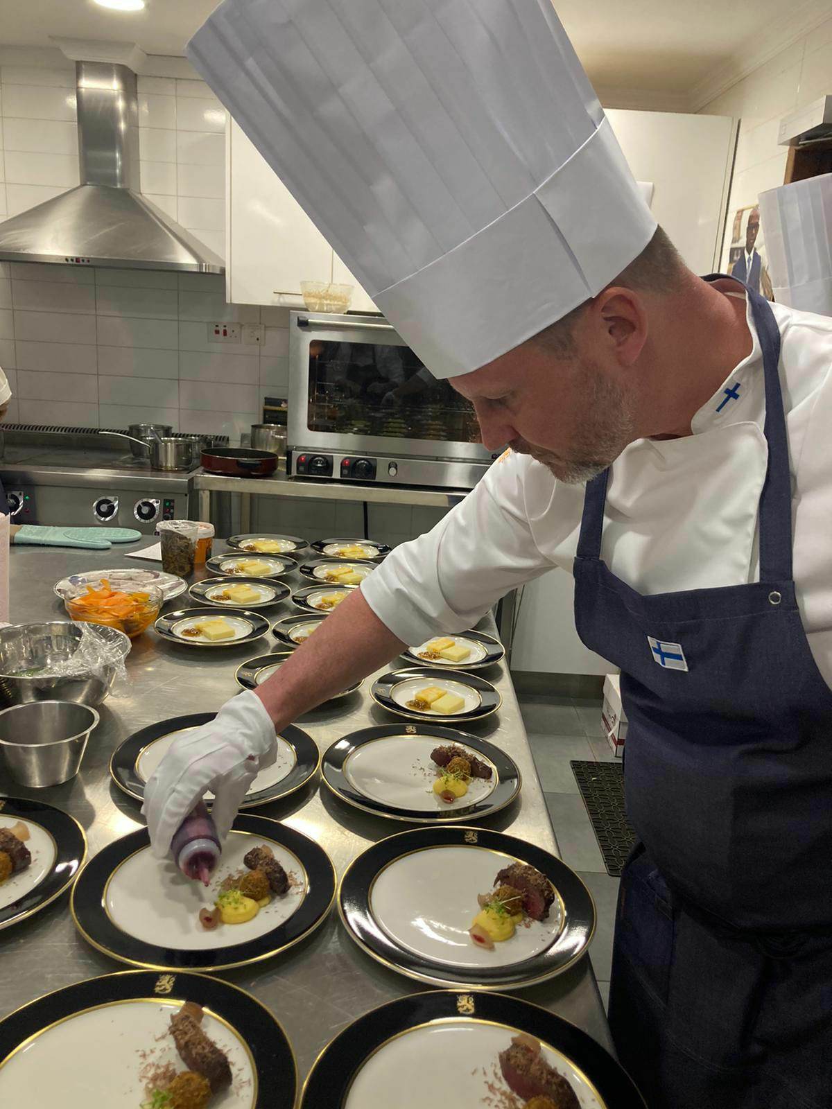 Teamwork makes a dream work! At 10 o'clock on Tuesday morning the car left from the hotel and day two at the Finnish embassy could start. The mice en place list was clear. After Monday's preparation day, there was still a lot to be done. We learned that communication and organizing is the key to success. Who is doing what, how long the mice en place is going to take and what equipment we would be using. Working in a kitchen is always teamwork. The team is as strong as its weakest link so we must help each other and ask for help if needed. Tuesday was the first day that our skills were put to a test. First dinner of the week started at 7pm full of important guests to be served. Luckily our teamwork and precision was rewarded at the end of the dinner, when the ambassador of Finland wanted to thank us in front of the guests and raise a glass for us. It was a truly amazing feeling! On Wednesday we will face another challenge when we will be serving a seven course menu to 16 guests. So as we say in the kitchen, thanks for the day!!