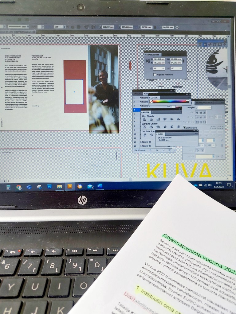 Sain materiaalit koneelle vuoden 2022 toimintakertomusta varten. Teen heille vanhan ulkoasun mukaisen vuosikertomuksen, johon sain graafiset aineistot (fontit, asettelut, värit, logot, ohjeistukset), tekstitiedostot, kuvat ja kuvatekstit. Pääsin aloittamaan työn keskiviikkona. Teen työtä Adobe Illustratorilla ja PhotoShopilla. Työn esiasetukset kuntoon laitettua, tekstien ja kuvien paikalleen laittaminen alkoi sujua. Paljon tarkkaa muotoilua tekstin suhteen, teksti vilisee taiteilijoiden ja tapahtumien nimiä ja päivämääriä. Työstä on tulossa suunnilleen 26 sivuinen A4 tiedosto.