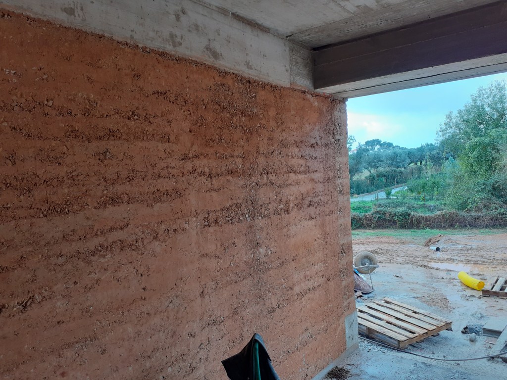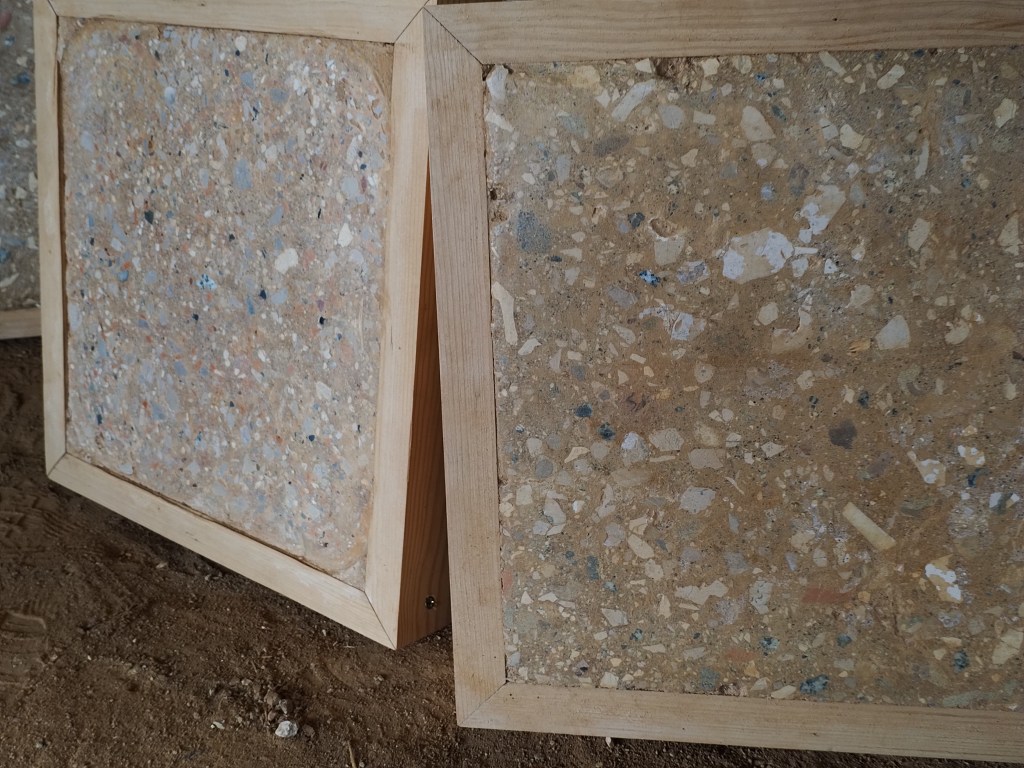 Savipitoisista maa-aineksista sekoitettiin kolme eri massaa ja tehtiin niistä testikuutiot sopivan seossuhteen löytämiseksi. Iskossaviseinän tekemisessä meitä opasti Nuno. Hänen projekteistaan löytyy lisätietoa nettivisuilta www.doing.pt .