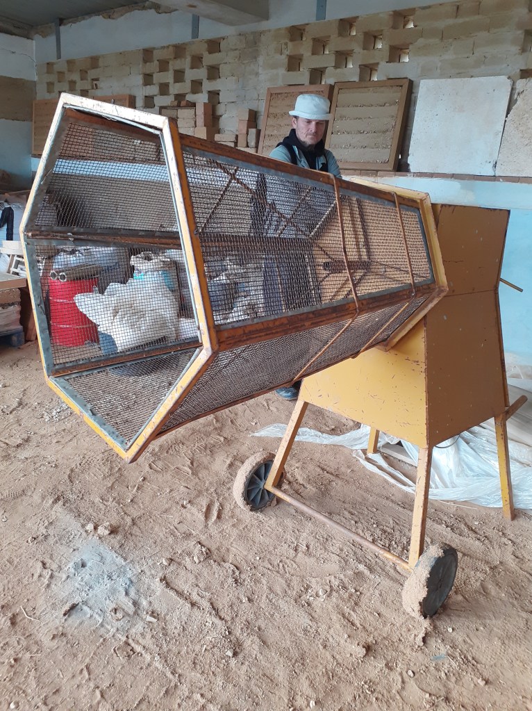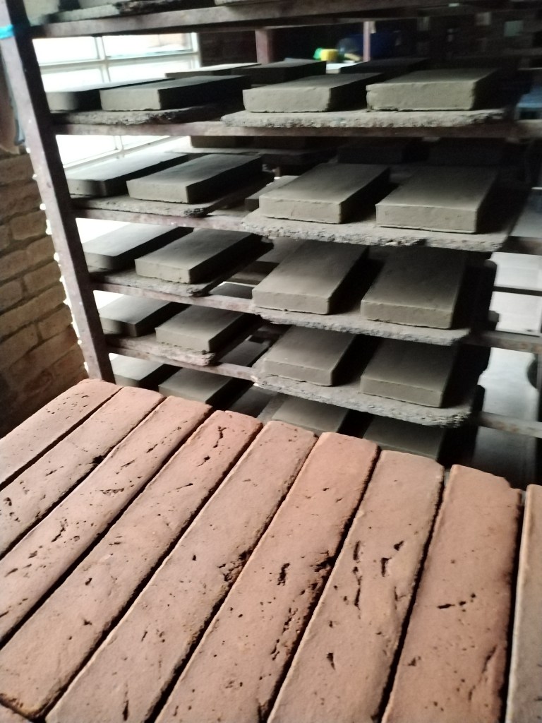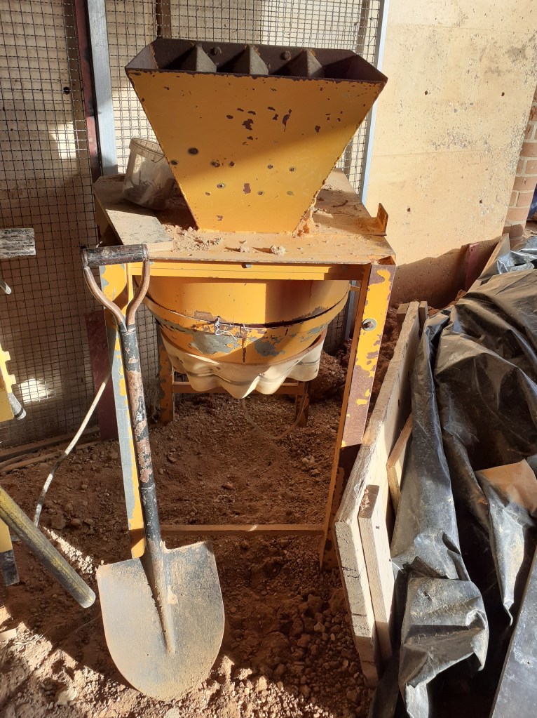 Rakennettavaa seinää varten osa porukasta kävi purkamassa hiekkapitoista massaa alueen huonokuntoisemmista savirakennuksista ja lisäksi paikalle oli tuotu savipitoista soraa. Paikalta löytyvää massaa halutaan siis käyttää uudelleen, mutta tehdä siitä soran avulla hieman vahvempi versio. Näistä kahdesta materiaalista tehtiin pienemmillä muoteilla kolme testikuutiota. Yhteen sekoitettiin molempia maa-aineksia sama määrä, toiseen 2 osaa sorapitoista ja 3 osaa hiekkapitoista massaa. Kolmeen kuutioon laitettiin 2 osaa hiekkapitoista ja 3 osaa sorapitoista massaa. Vettä lisättiin sumutinpullolla ja sopiva massan kosteus testattiin puristamalla käsillä tiiviitä palloja. Massat juntattiin kuutioiksi muottien avulla myöhempää analyysia varten. Massoista tehtiin myös pallot ja nekin jätettiin kuivumaan. Tarkoitus oli löytää sopiva massan rakenne, jossa pienemmät kiviainekset täyttävät isompien sorakappaleiden välit eli eri raekokojen suhde on mahdollisimman tasainen.
