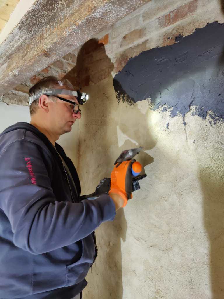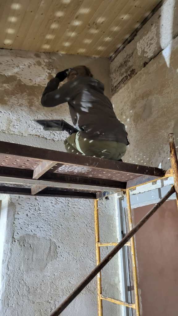 Päivä oli sateinen ja muinakin päivinä ilmankosteus oli ollut korkea. Niinpä aamulla totesimme, että seiniin aikaisemmin tekemämme pohjarappaukset olivat liian märkiä pintarappausten tai stucco-pintojen tekemiseen.