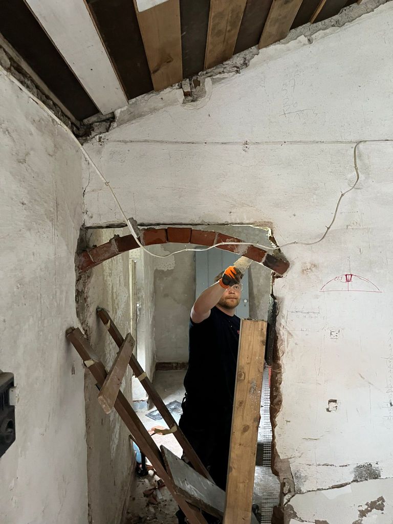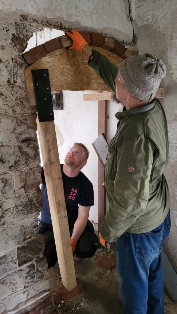 Iltapäivän ajan mietimme ja toteutimme Timo Kallion kanssa matalakaarista holvausmuurausta tiilillä oviaukon yläpuolelle. Toteutettavan holvikaaremme malli oli valittu äänestyksellä kolmesta eri vaihtoehdosta edellisenä iltana. Vaihtoehto joka jätti oviaukon suurimmaksi eikä vaatinut tukipylväitä voitti. Pilarien sijaan Timo oli sorvannut ovenreunan tiilille sopivat kolot seiniin.