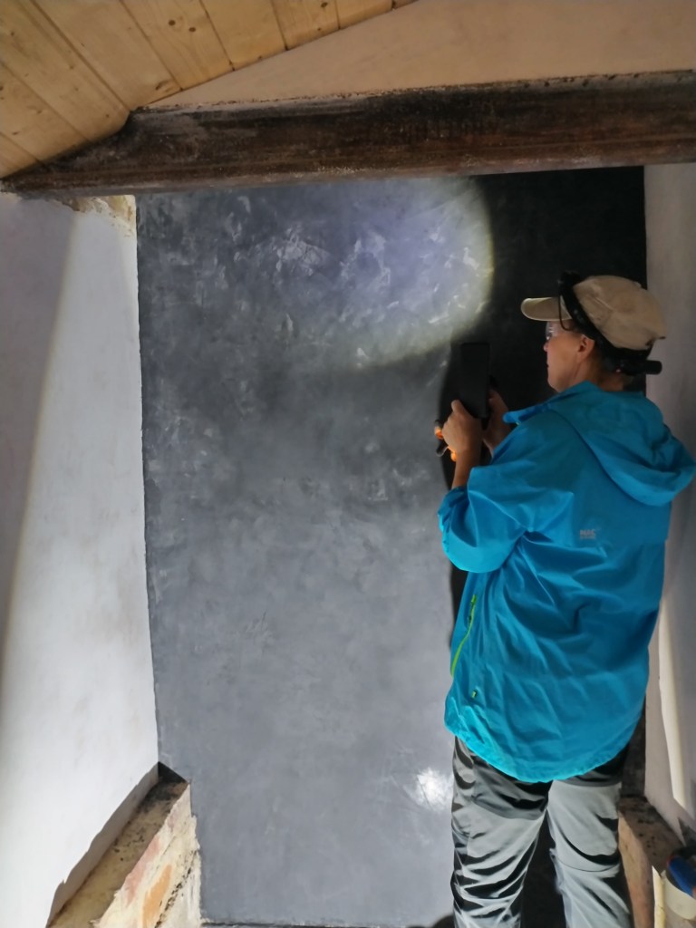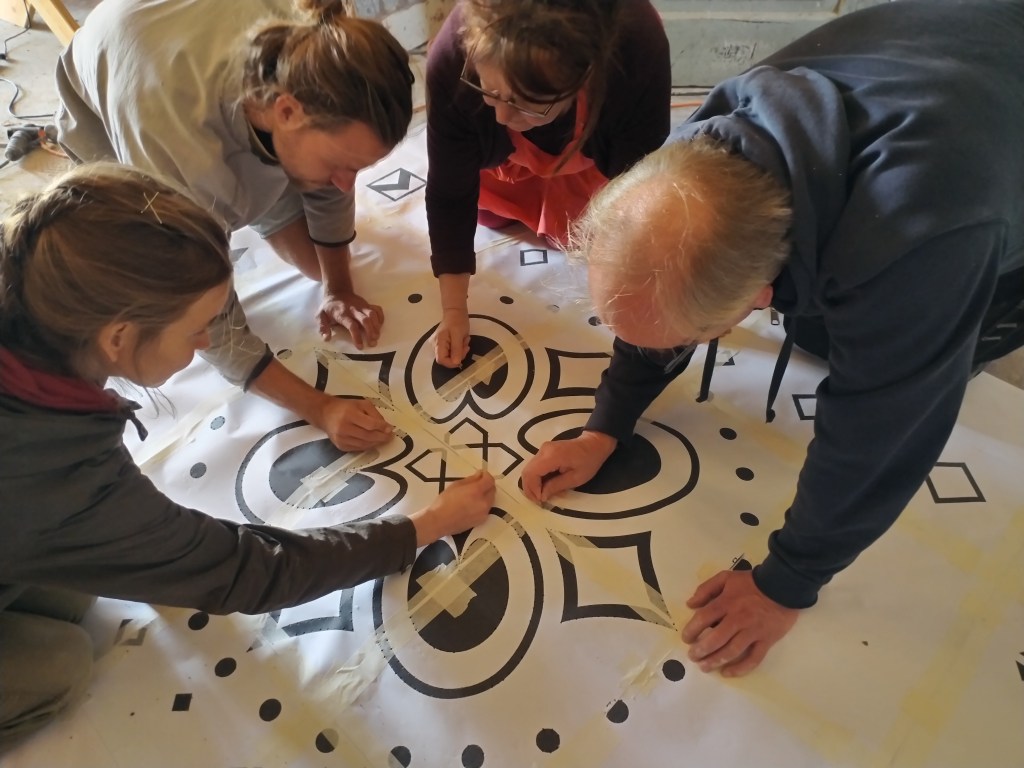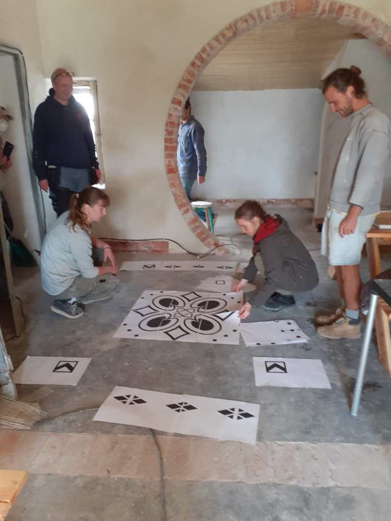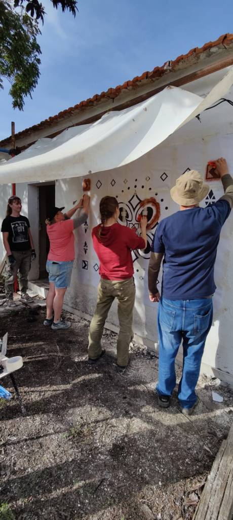 Scraffito-lakana teipattiin vielä kostean laastin päälle. Työharjoittelussa oleva Portugali-arkemme sujumisesta vastaava sveitsiläinen Fiona luovutti palan T-paitaa, josta askarreltiin narun avulla pieniä väripigmenttiä sisältäviä pussukoita. Näitä pigmenttipussukoita läpsyteltiin paperilakanassa olevien naulanreikien päällä, jolloin pigmentti värjäsi paperissa olevien reikien kautta seinälaastin ja teki siten scraffiton kuviot näkyväksi.