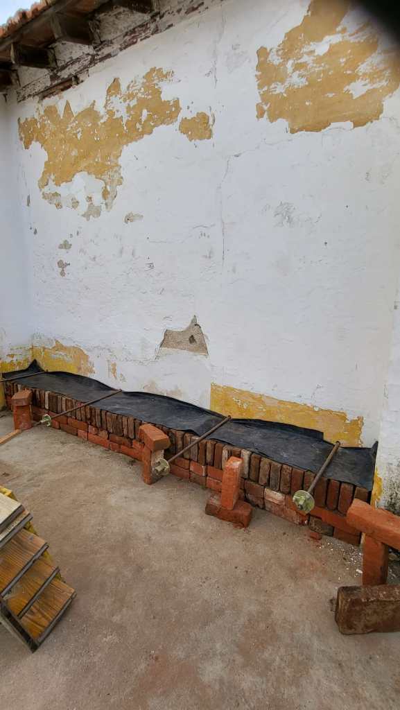 Yksi kunnostettavan rakennuksen (se jossa on reissun aikana hommia paiskittu) seinästä oli vain noin 10 cm paksu, joten sitä haluttiin vahvistaa tekemällä iskossaviseinä ulkopuolelle. Seinää työstettiin maan tasalla olevan betonilaatan päälle. Seinän alaosaan tehtiin tiililadonta, jotta seinä säästyy isommalta osalta maasta imeytyvästä kosteudesta.