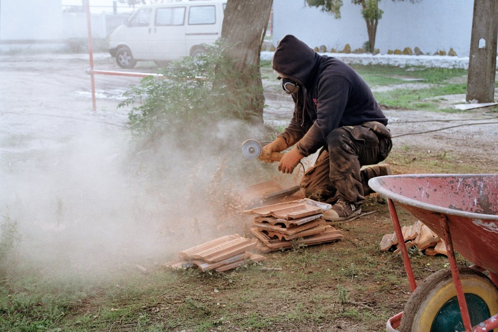 Iskossaviseinän rakenne oli seuraava: betonilaatta, jonka päälle tiililadonta. Kapillaarikatkona tiilien päälle leikattiin kaistale muovia ja eroosiokatkona käytettiin kiertotalouskattotiiliä eli ympäristöstä löytyvistä rakennuksista purettuja tiiliä. Käyttämämme vanhat kattotiilet puolitettiin timanttilaikalla ja reunat puhdistettiin vanhasta sementistä.