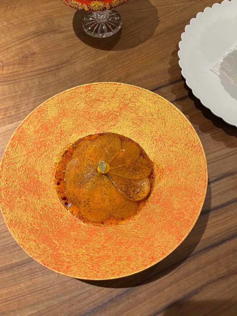 kuvassa. Peuratartar,dijonjäätelöä ja myskikurpitsaa 5dellä tavalla. Kuva omasta galleriasta