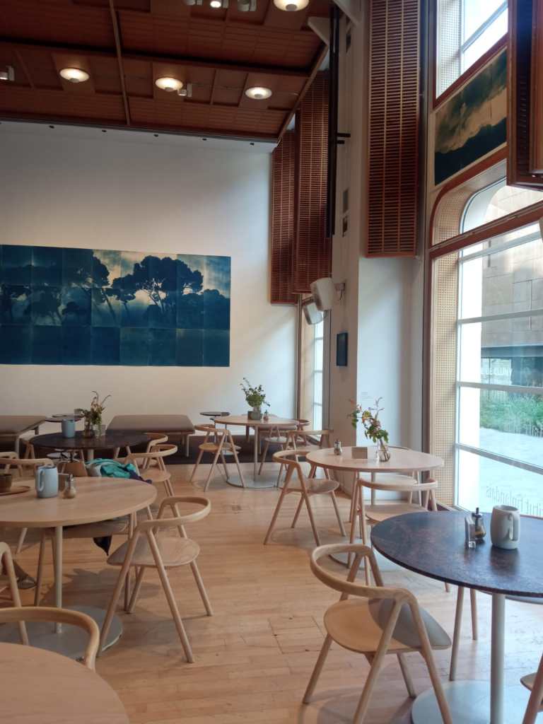 Kahvilassa taiteen lisäksi oli tarjolla tietenkin Suomalaisia herkkuja ruisleipää löytyi usella eri täytteillä savulohesta perunaan. Lounasaikaan kahvilasta sai salaattiannoksia ja tietenki tarjolla oli mustikkapannukakkua, karjalanpiirakoita, pullia ja kahvia niin erikoiskahveja kuin tavallista kahvia.