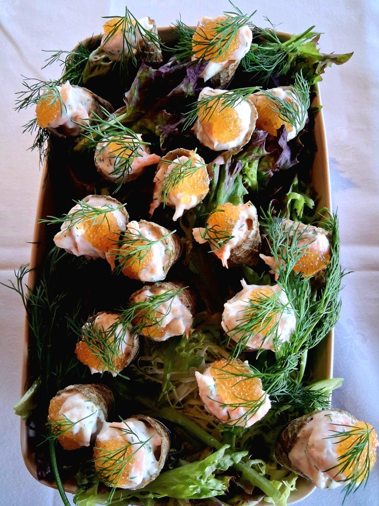 Mondo frescolta olimme saaneet levätöttöröitä joihin teimme skagen-massan. Pienet sienipiiraat kokosimme heiltä tulleisiin neliön mallisiin piiraspohjiin. Tarjosimme myös Jennin pihlajanmarja-marmeladeja.