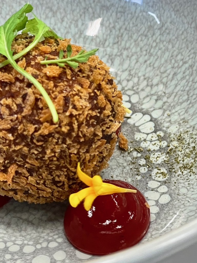 Knöödeleistä sain myös idean. Gnocchi-tyyppinen perunataikina joka pyöritetään palloksi – keitetään ja syödään esimerkiksi keitossa. Muistutti arancinista. Päätin että tehdään hirvellä täytetty knöödeli 5 ruokalajin menun keittiön tervehdykseksi.