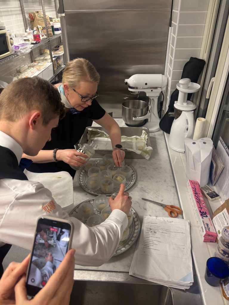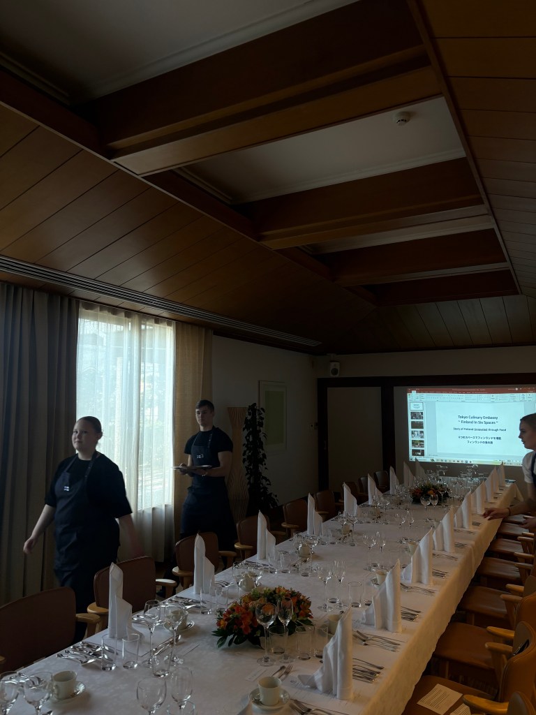 Toinen tilaisuutemme suurlähetystössä Japanissa oli illallinen “Story of Finland”, ja tämä tapahtuma jännitti meitä kaikkia enemmän kuin mikään aiemmin. Illan menu oli seitsemän ruokalajin kokonaisuus, joka kertoi suomalaisesta ruokakulttuurista ja historiasta. Jokainen ruoka sisälsi myös sponsorimme tuotteita, ja kokonaisuuden kruunasivat yhteensä kymmenen juomaa, viinejä, cocktaileja ja mocktaileja.